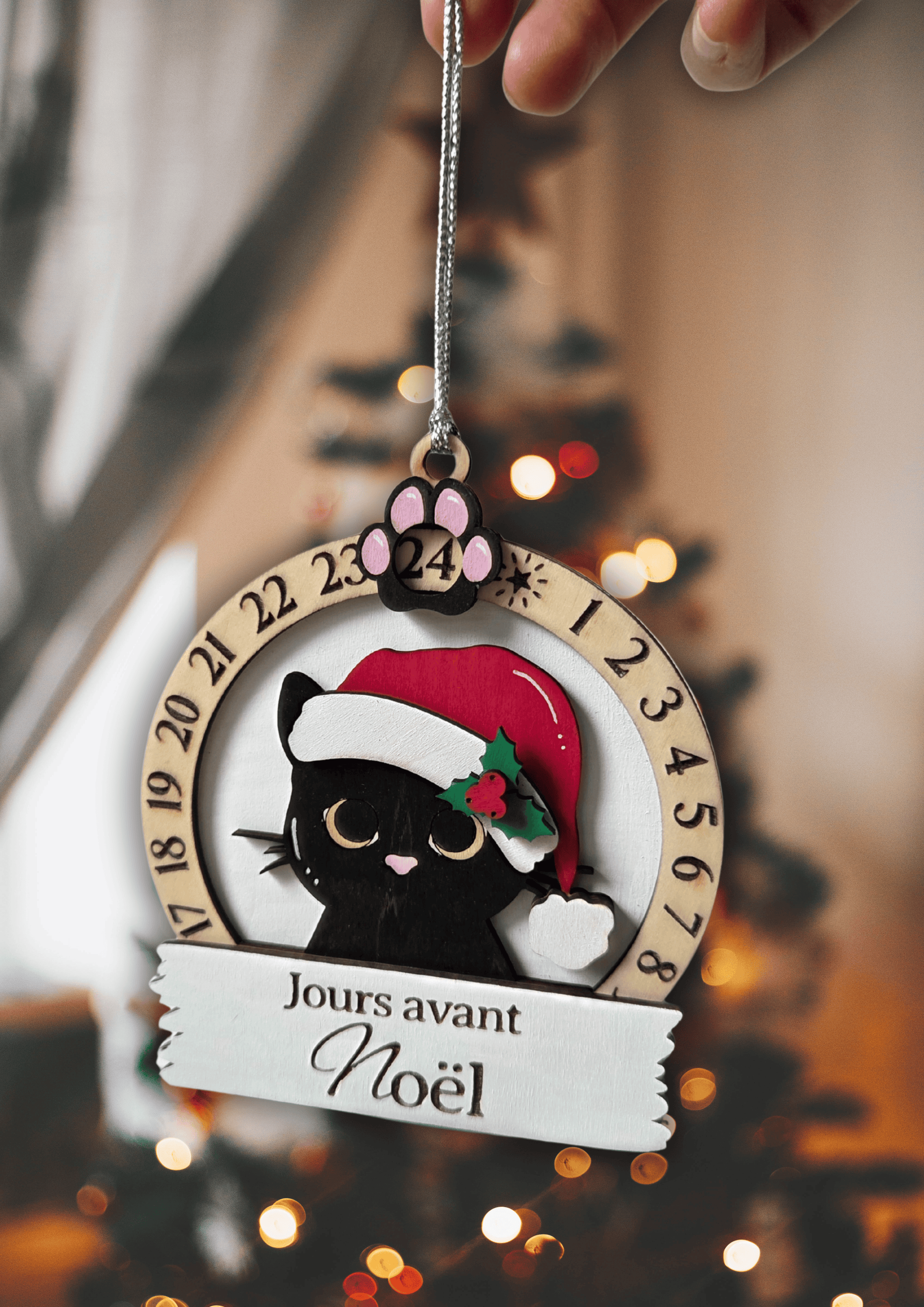 - Design : chat festif avec bonnet de Noël et inscription “Jours avant Noël”