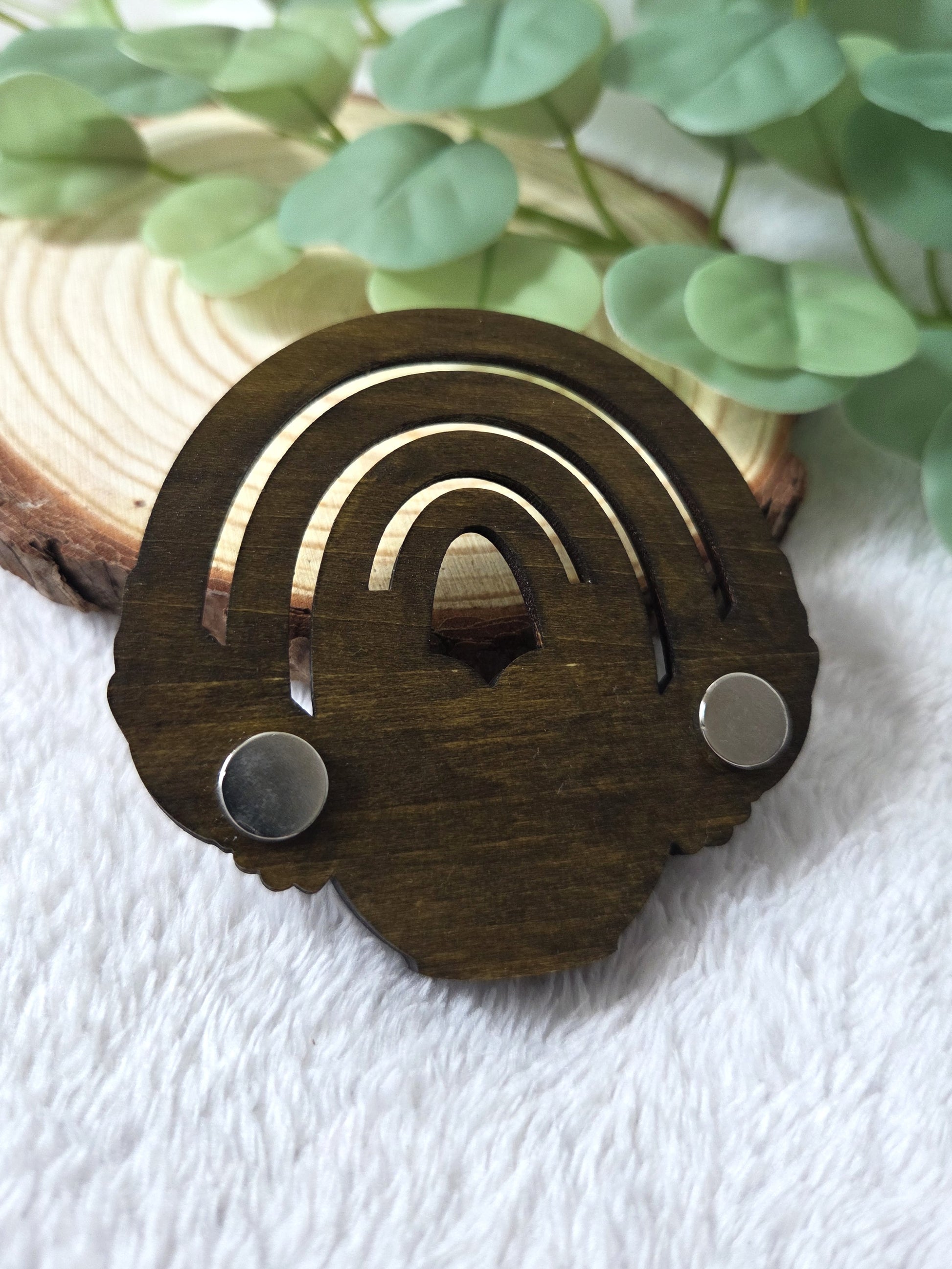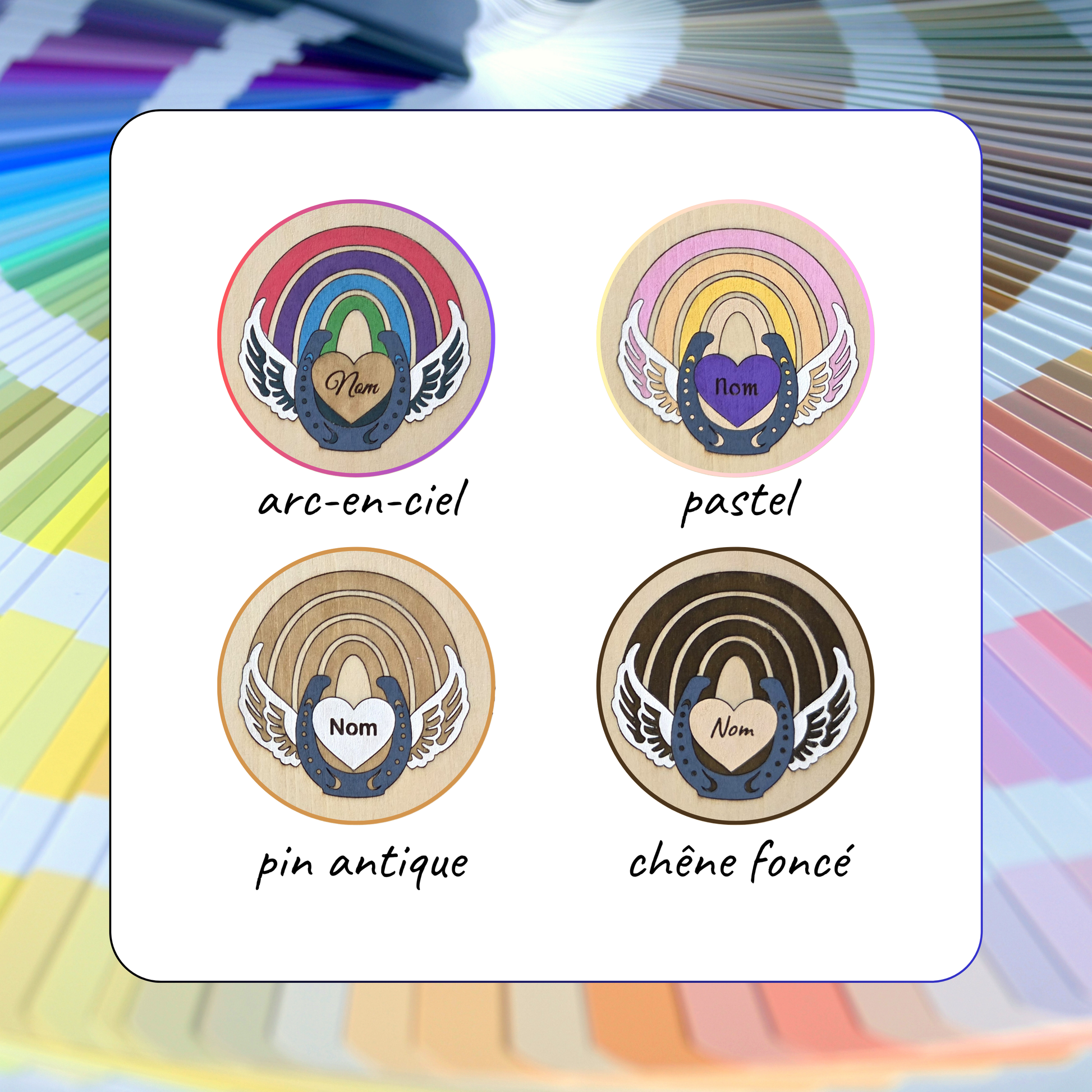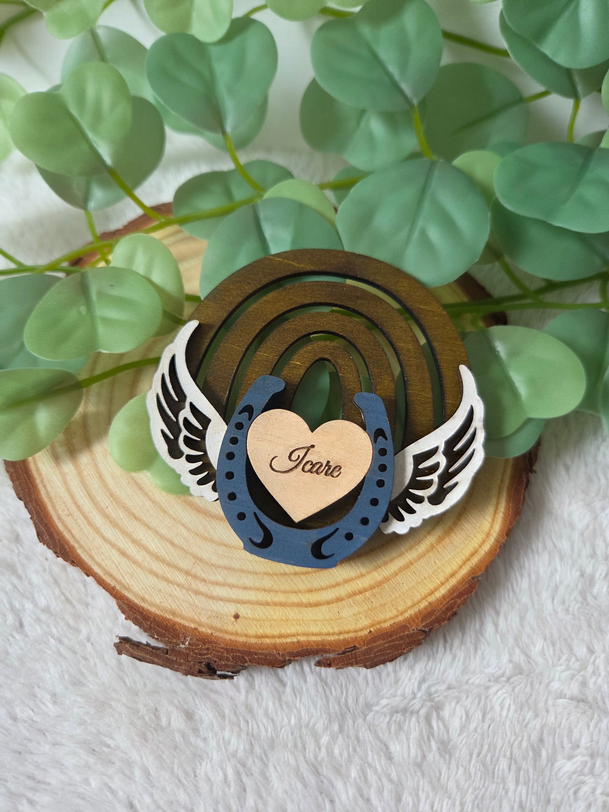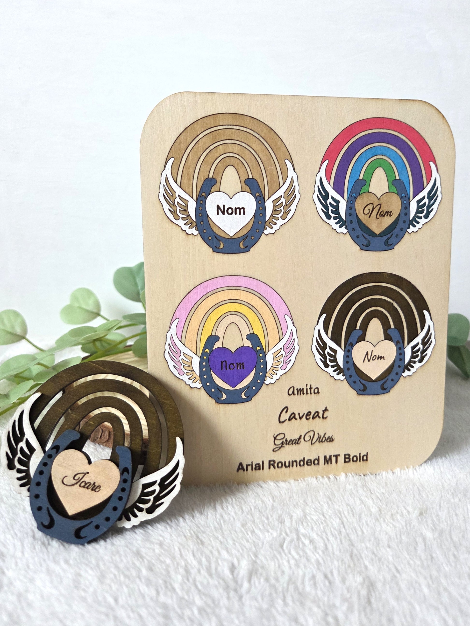 Gardez un souvenir précieux de votre compagnon équin avec ce magnet commémoratif en bois représentant un arc-en-ciel stylisé, un fer à cheval, un cœur gravé au prénom de l’animal, et des ailes d’ange blanches ✨